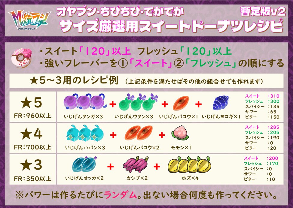 (使えるきのみの上限はシナリオ進行で解放) - ドーナツの色とパワーは一番フレーバーの数値が高いもので決まる