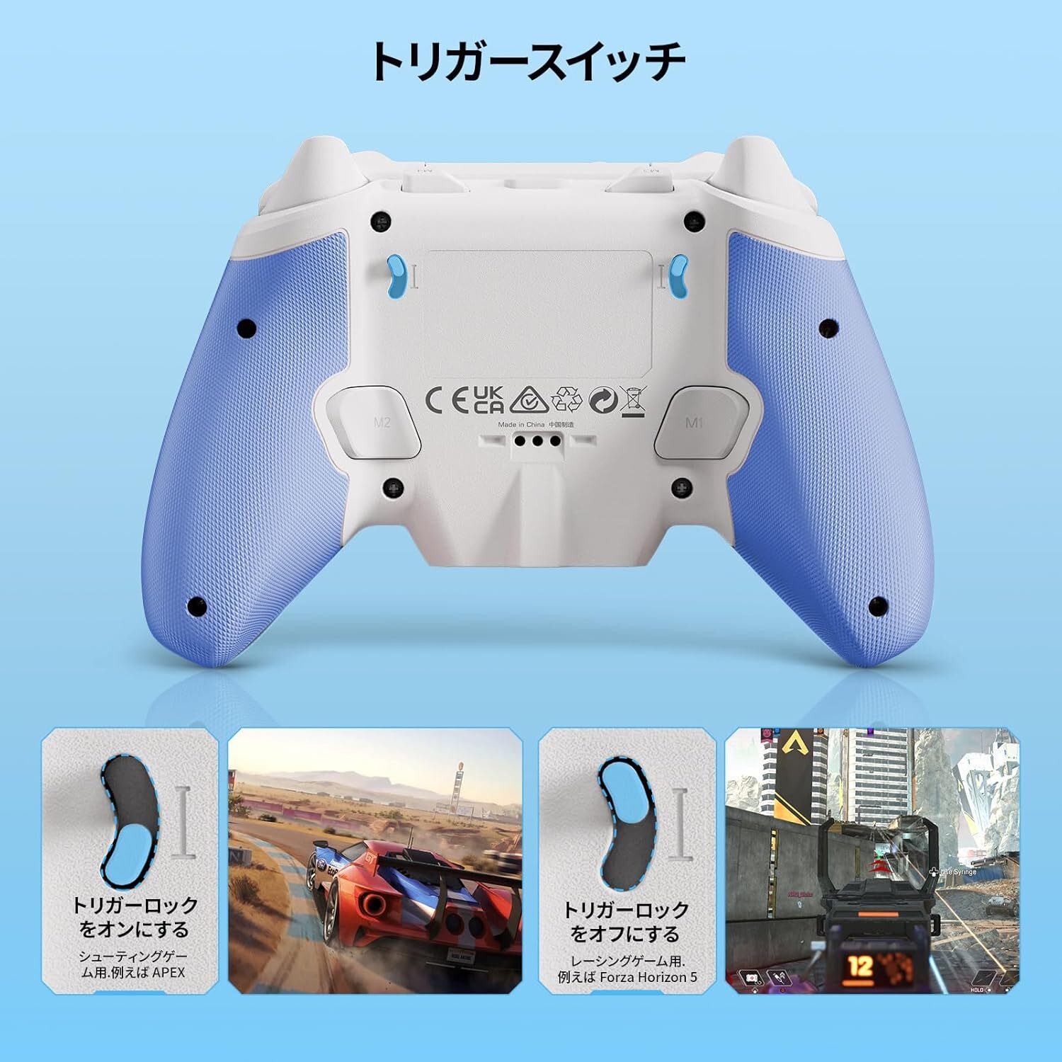 背面のツマミを操作することで、トリガーボタン(LT、RT)の深度を調整可能です。