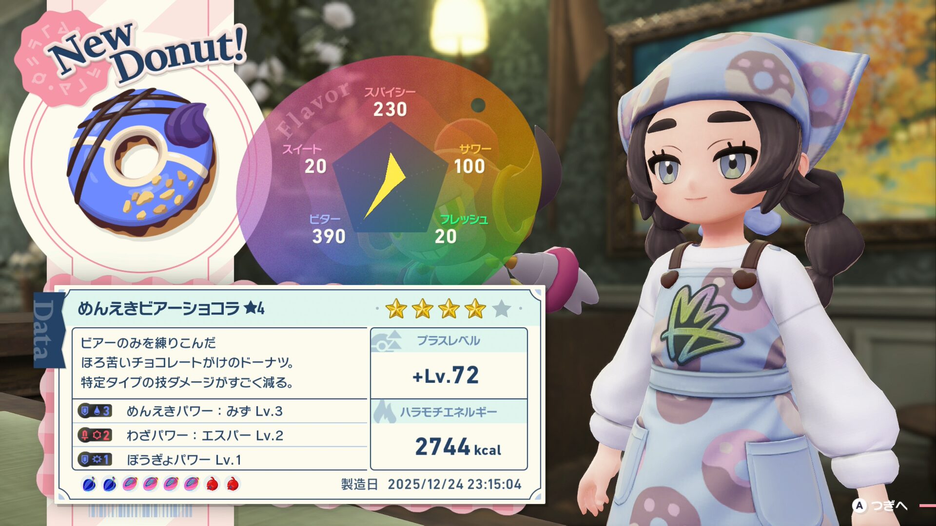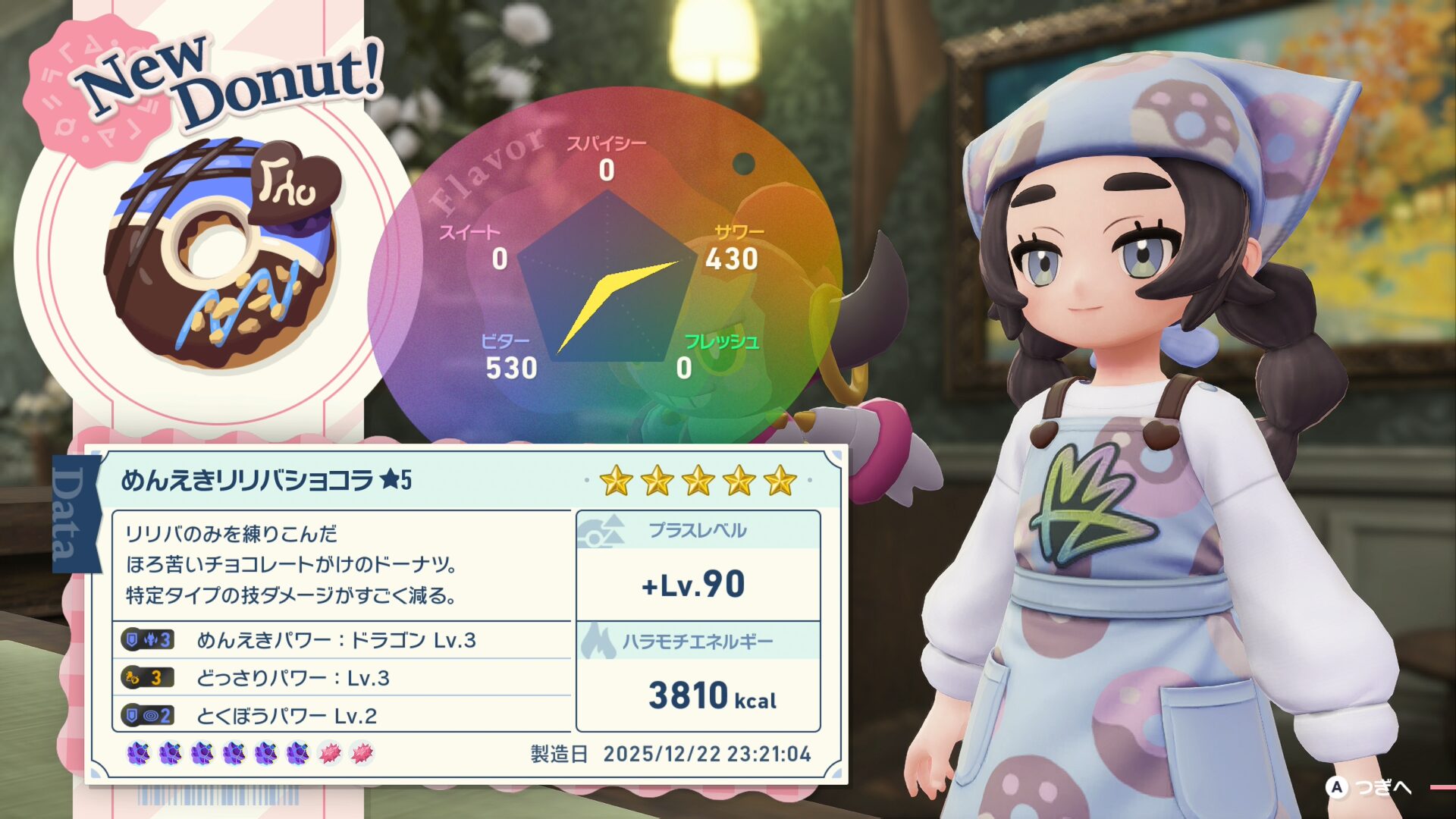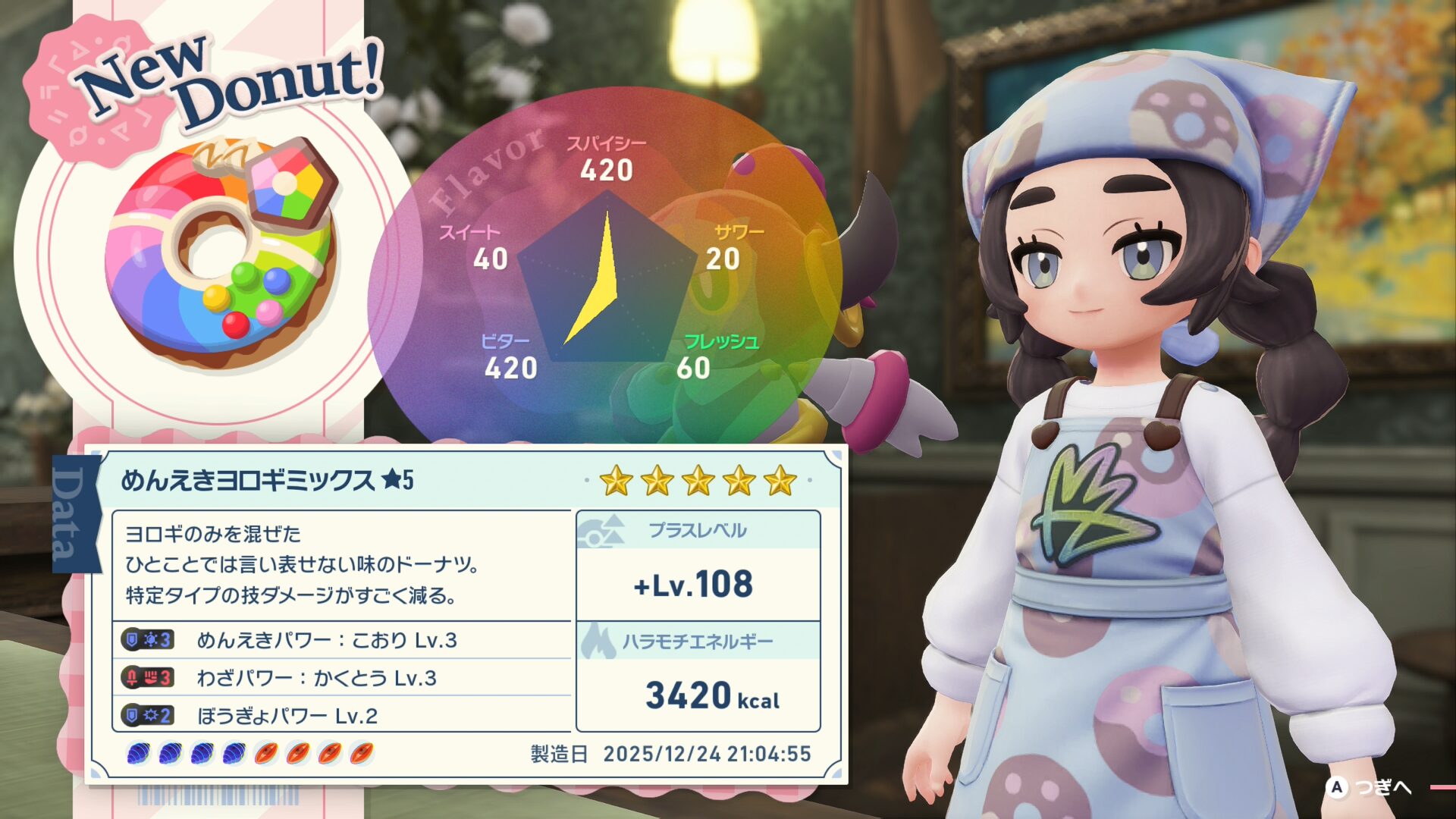 (使えるきのみの上限はシナリオ進行で解放) - ドーナツの色とパワーは一番フレーバーの数値が高いもので決まる