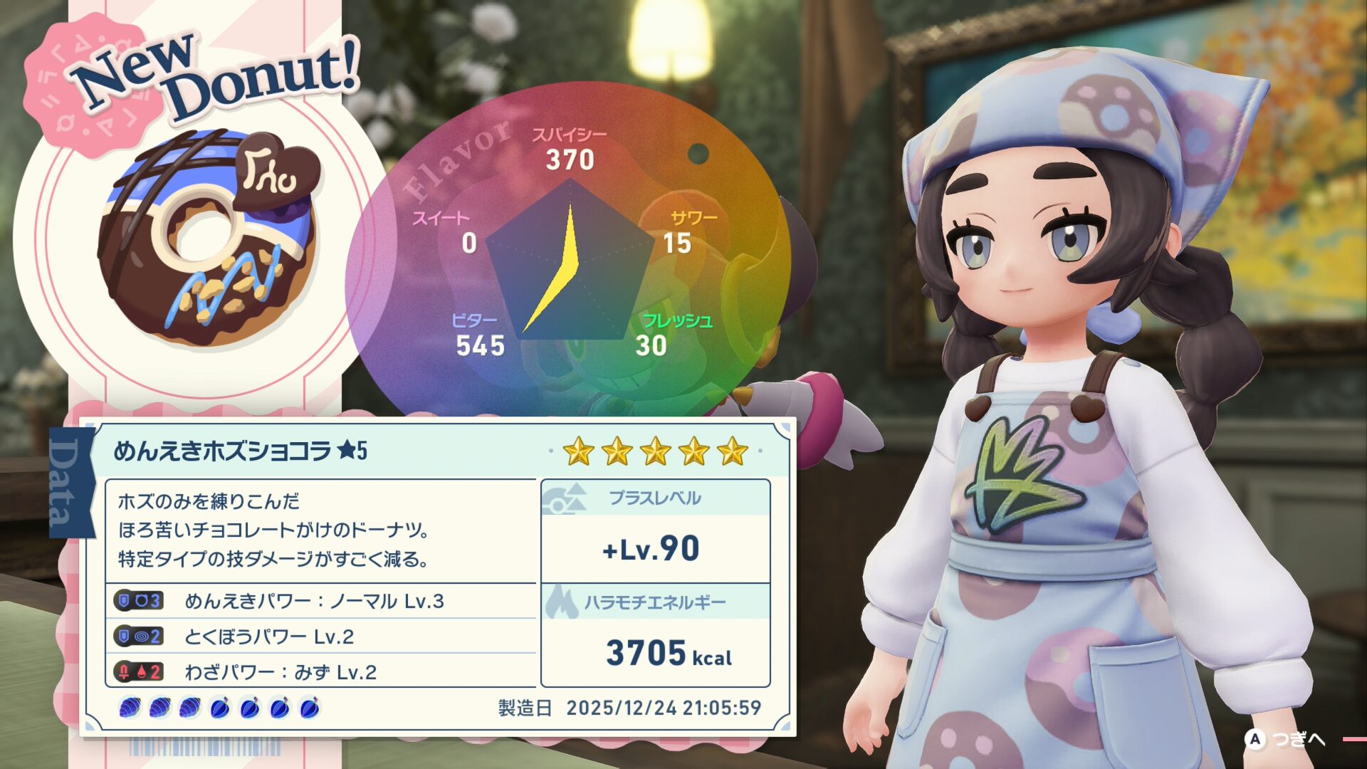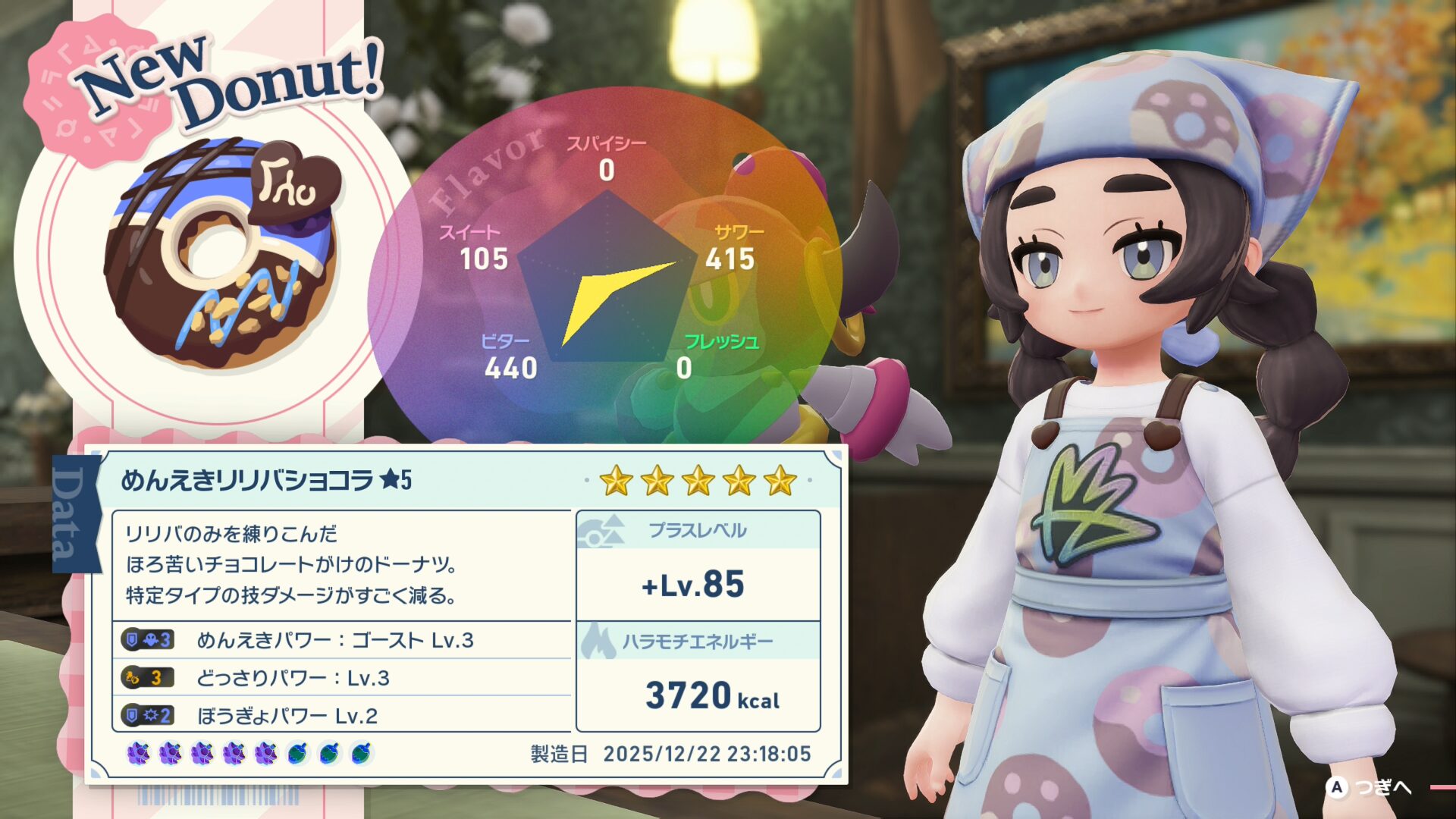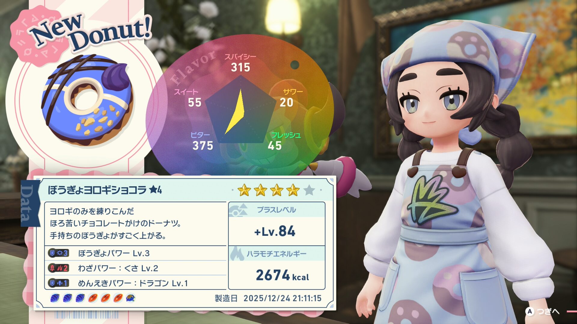 (使えるきのみの上限はシナリオ進行で解放) - ドーナツの色とパワーは一番フレーバーの数値が高いもので決まる