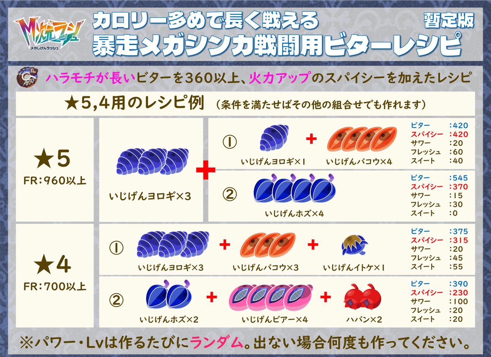 暴走メガシンカは★5での出現固定なのでレシピは★5と4のみです。