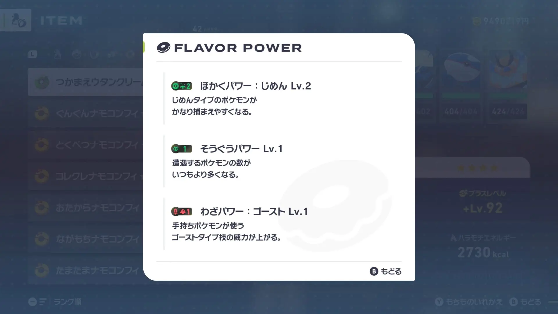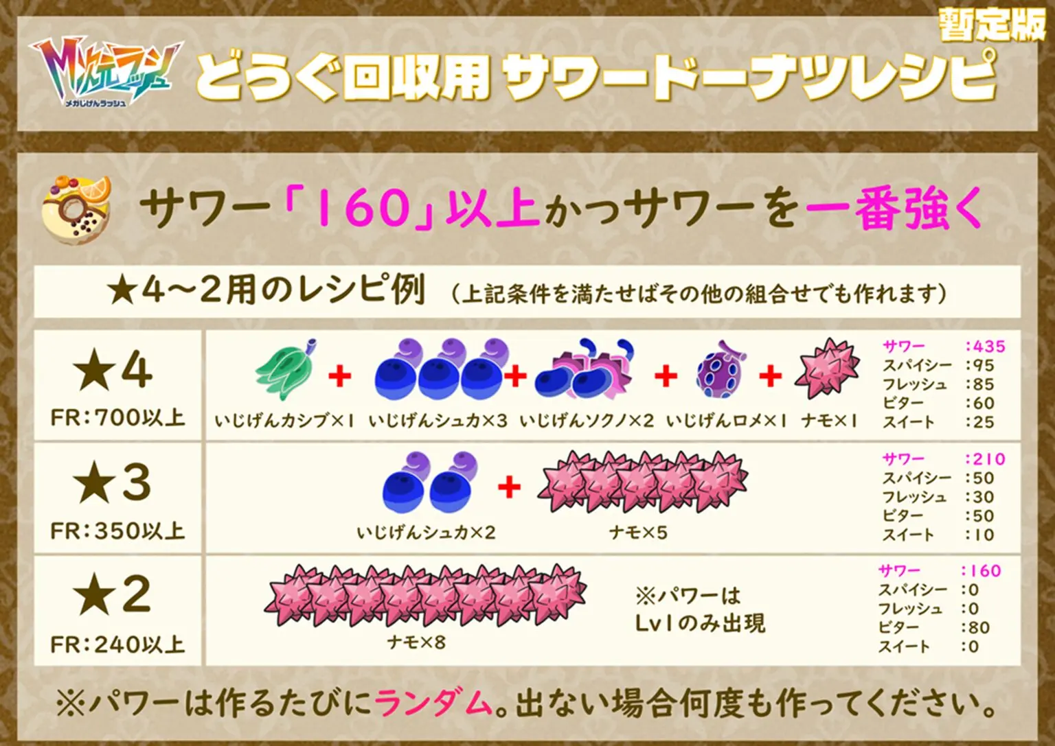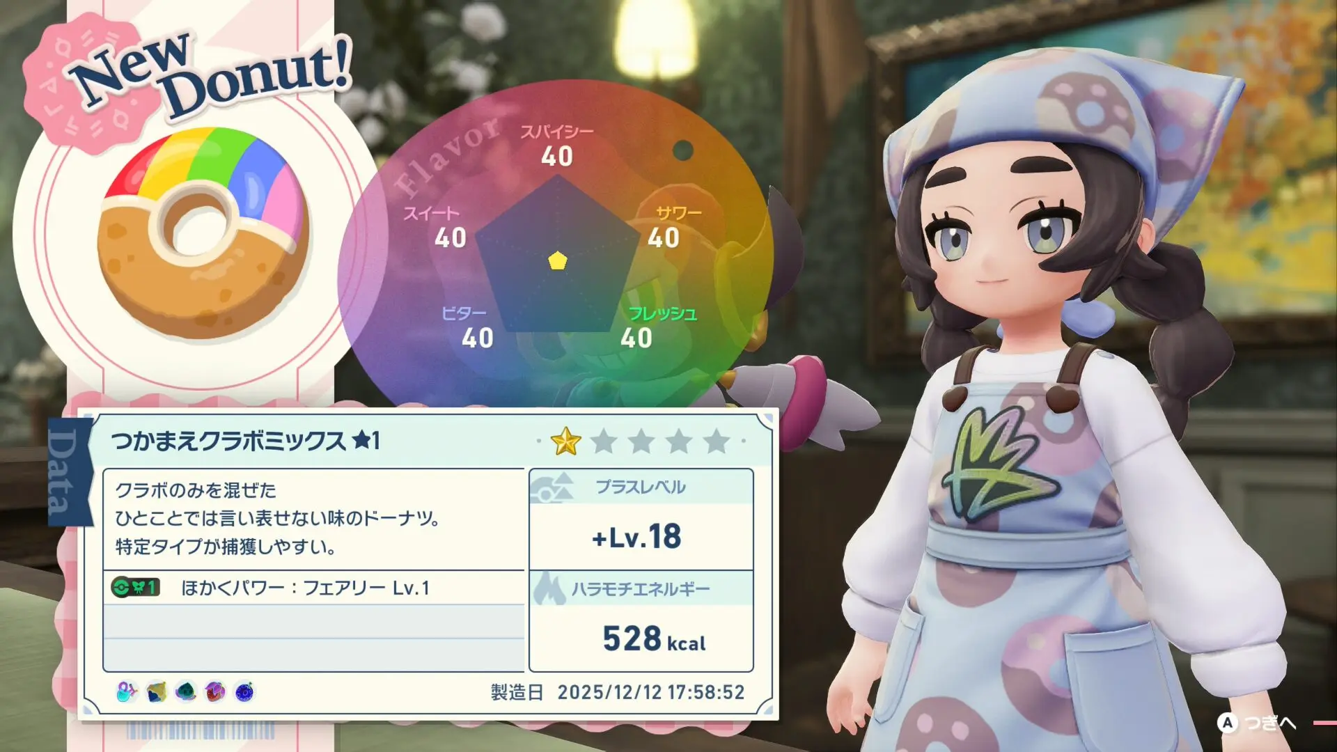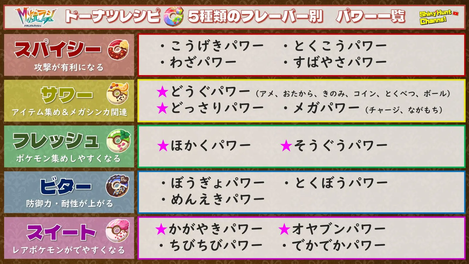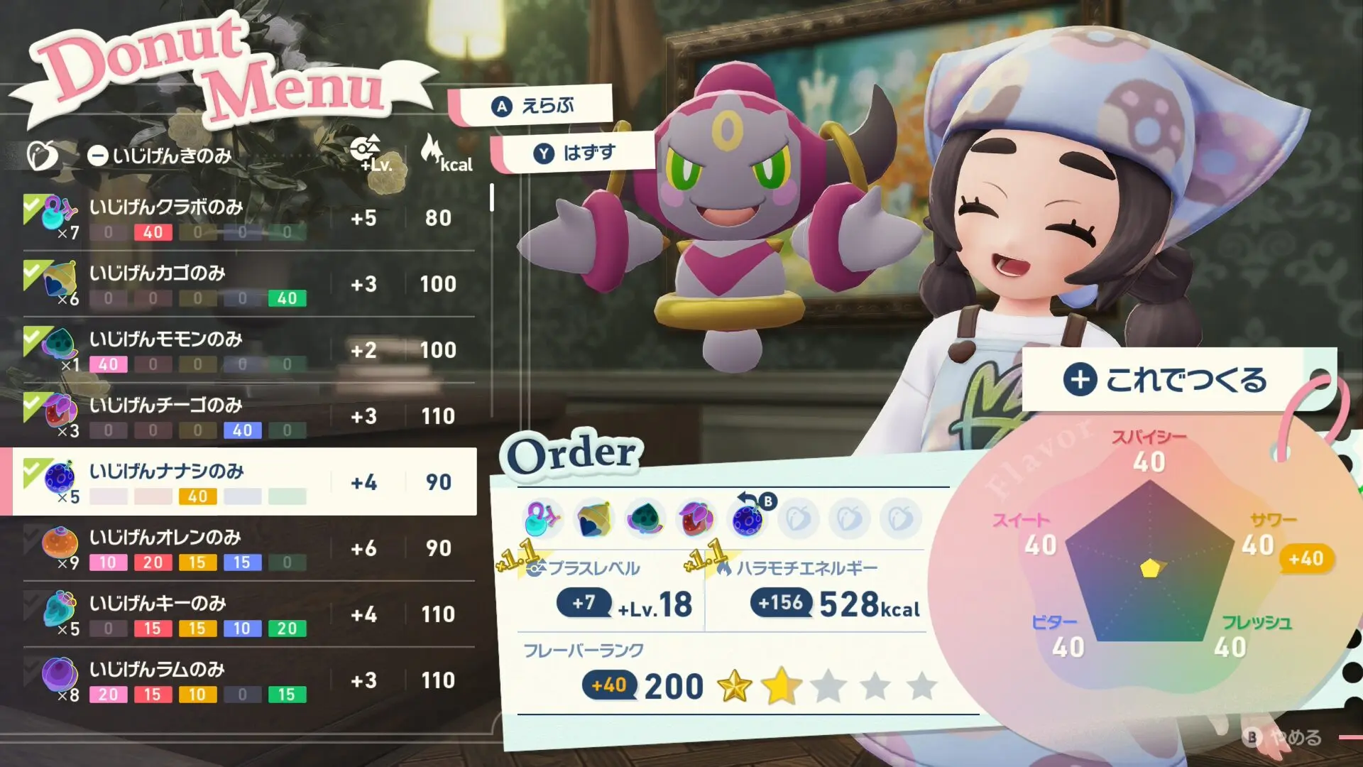 (使えるきのみの上限はシナリオ進行で解放) - ドーナツの色とパワーは一番フレーバーの数値が高いもので決まる