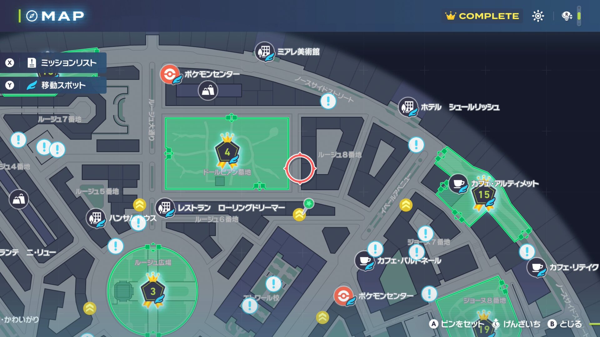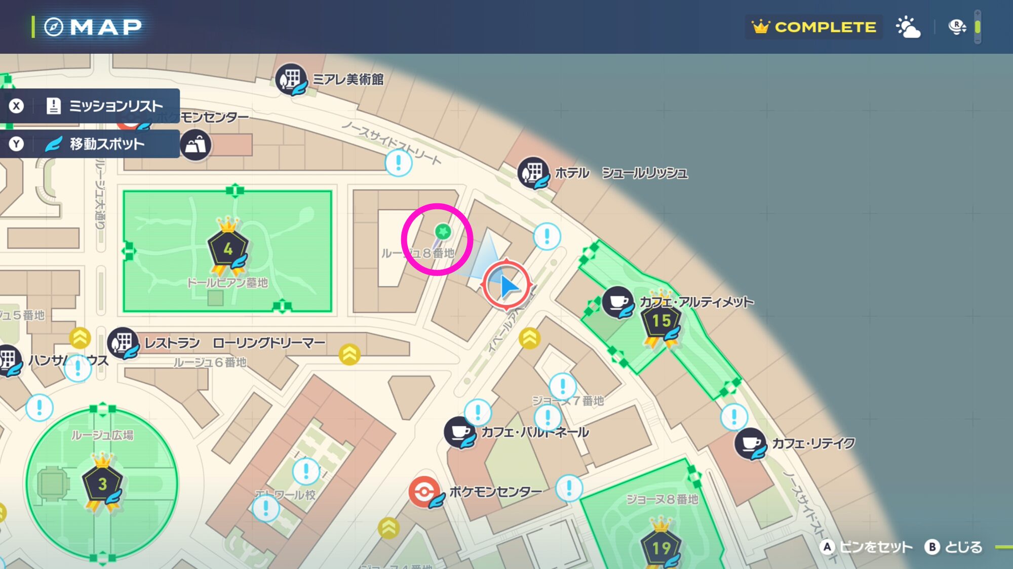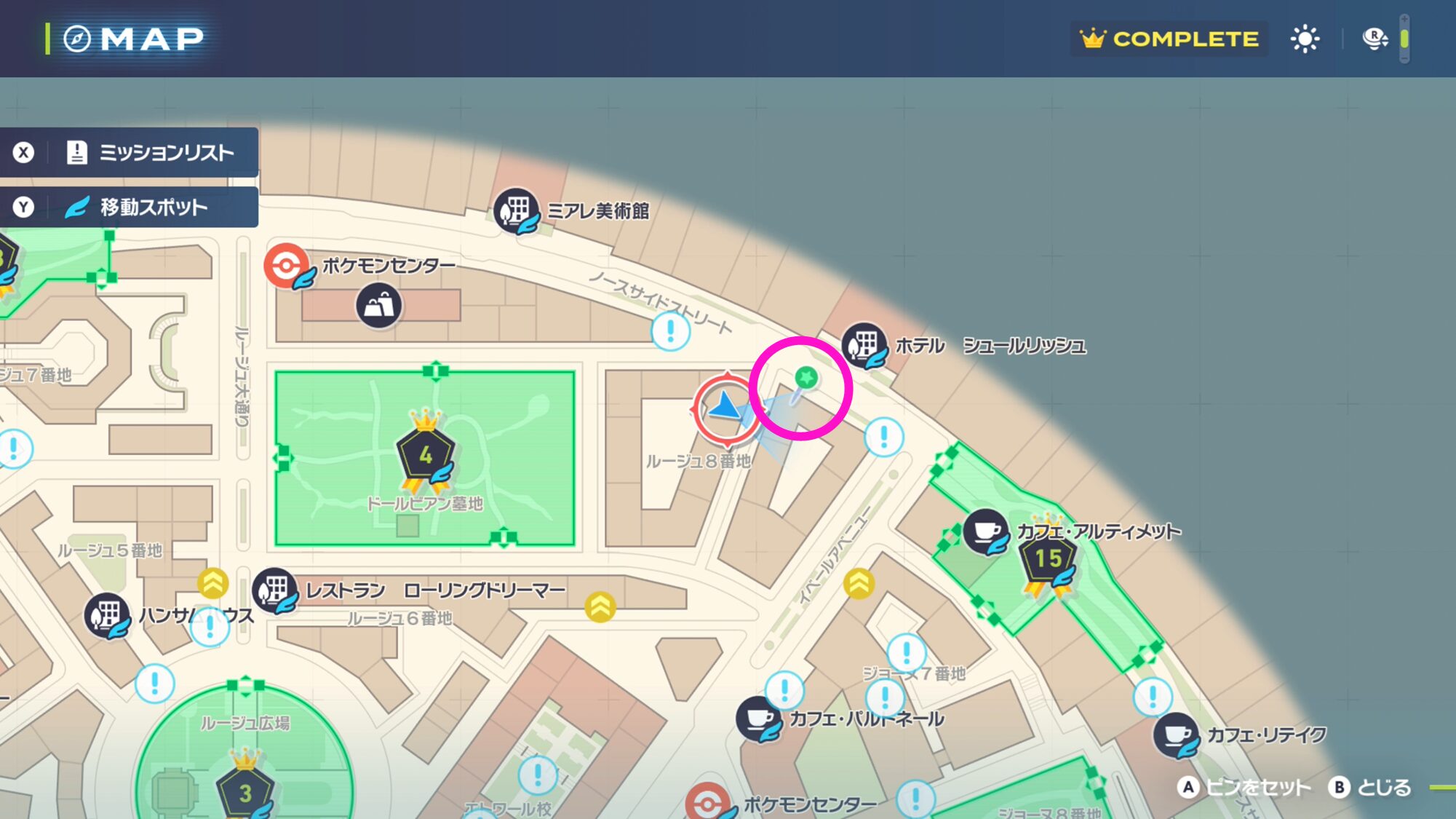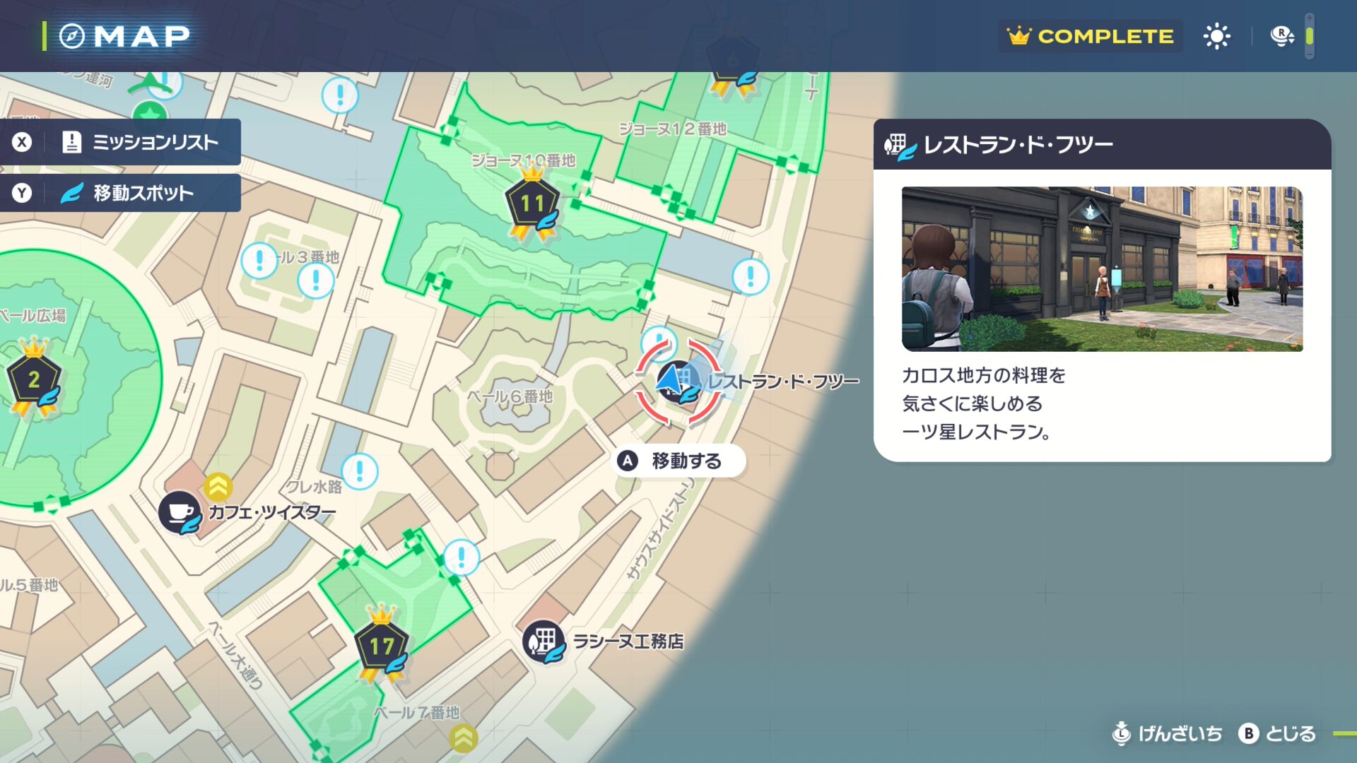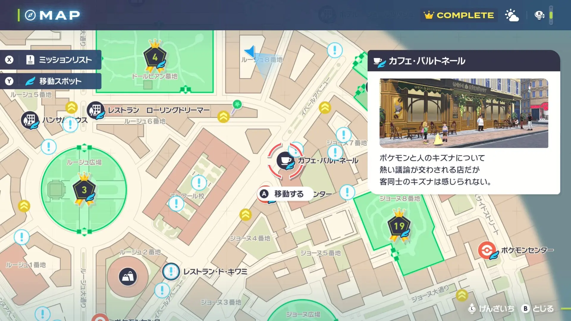 最寄りのファストトラベルである「カフェ・パルトネール」か「ポケモンセンター:イベール」まで移動します。