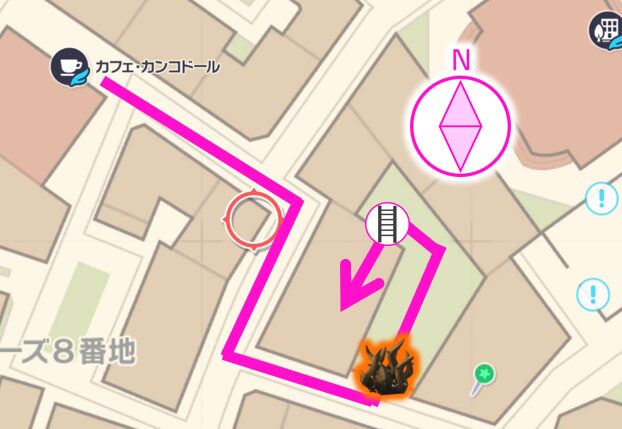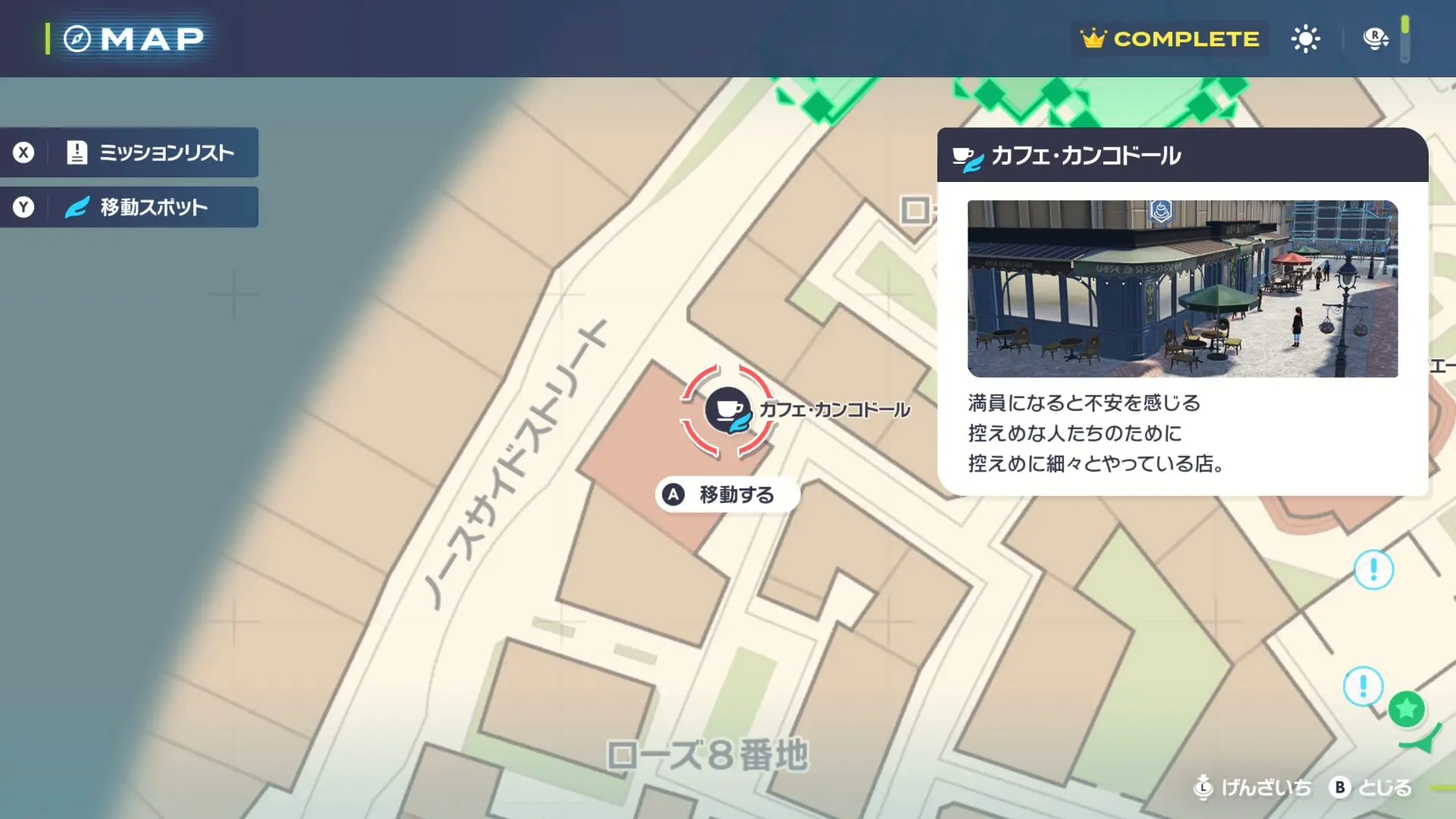 最寄りのファストトラベルである「カフェ・カンコドール」まで移動します。