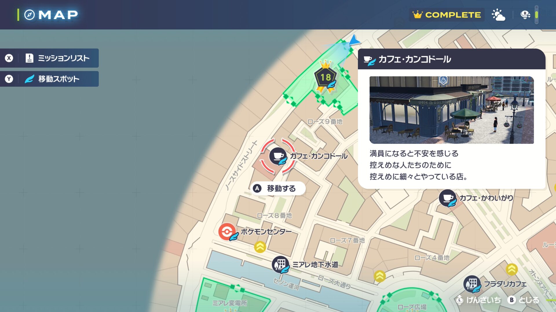 最寄りのファストトラベルである「カフェ・カンコドール」まで移動します。