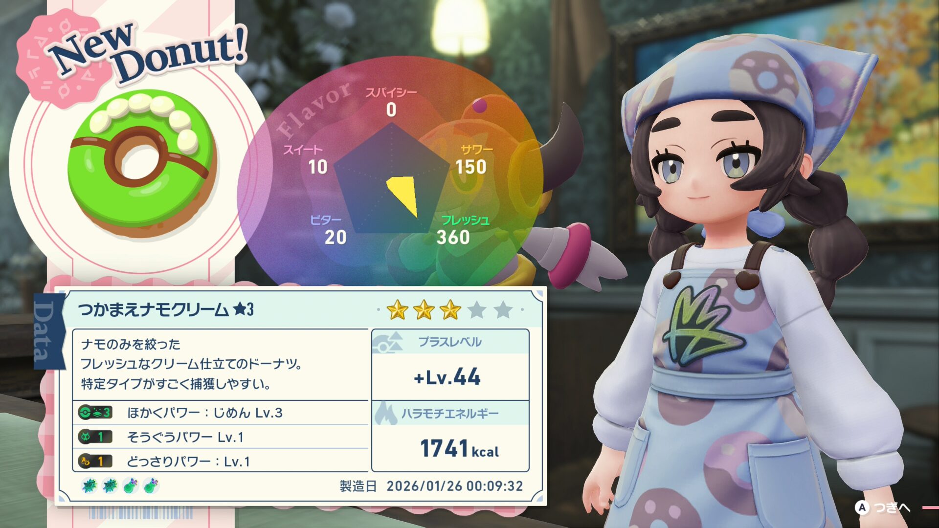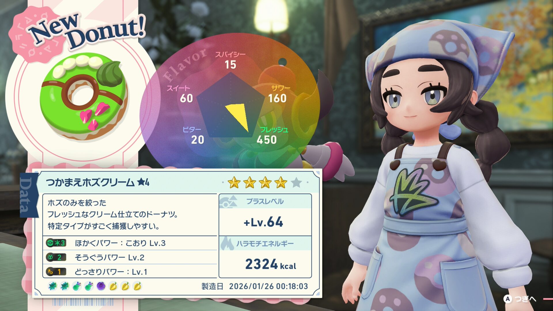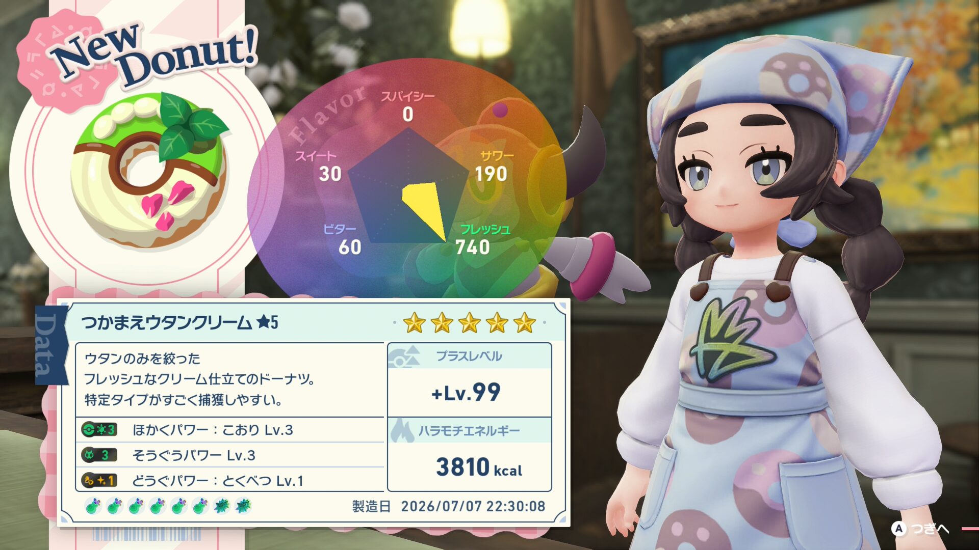 (使えるきのみの上限はシナリオ進行で解放) - ドーナツの色とパワーは一番フレーバーの数値が高いもので決まる