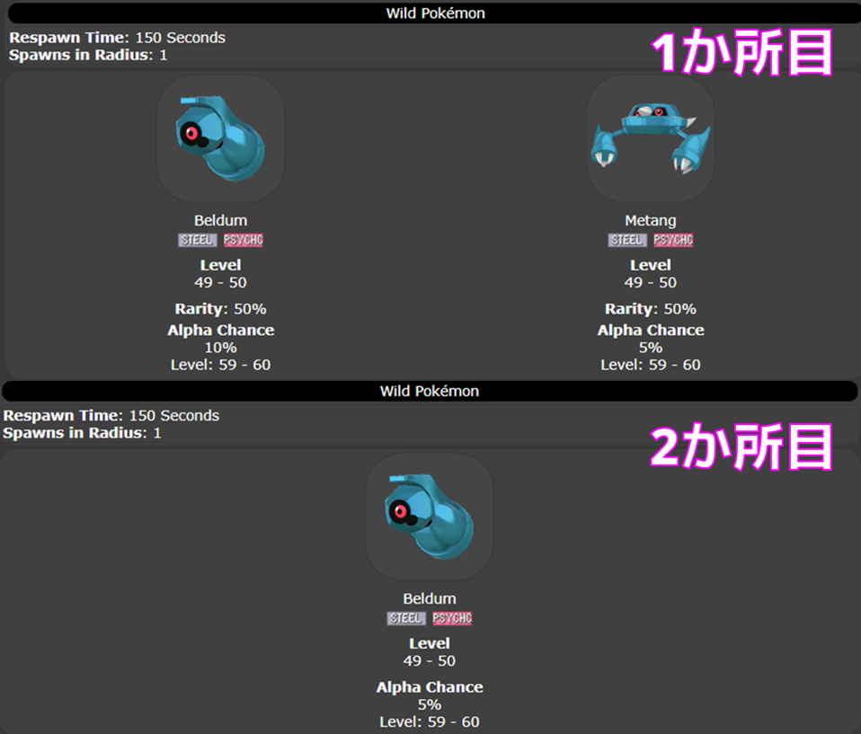1か所目:ダンバル10%、メタング5%(それぞれの出現確率は50%ずつ)