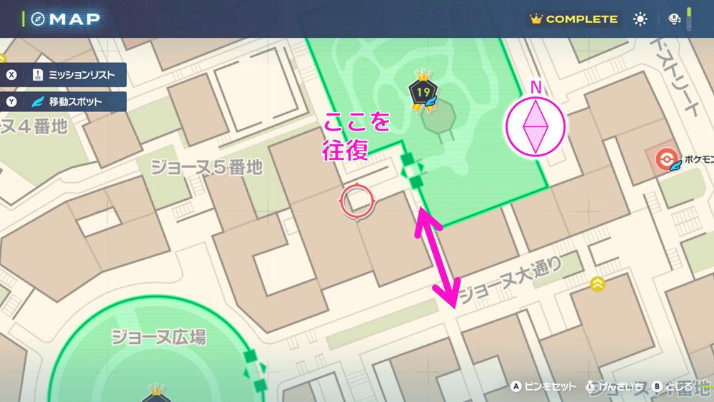 中央の建物にピンを立てて、距離40~70位を往復すればリポップ可能です。