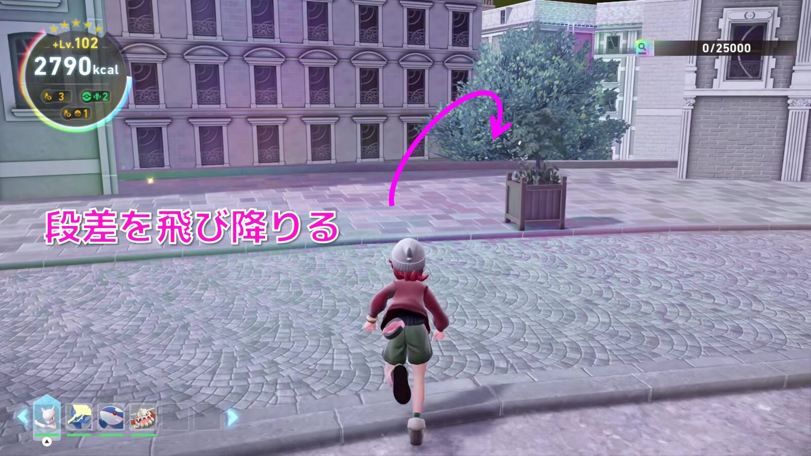まず、右斜め前の段差を飛び降り、ウツボットの群れを通過します。