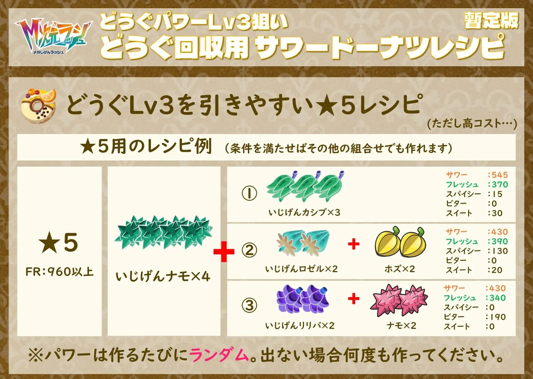 次の章で暴走メガシンカ、★5バトル異次元、★5ワイルド異次元を巡回する際に役立つドーナツレシピを紹介します。
